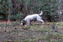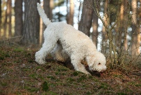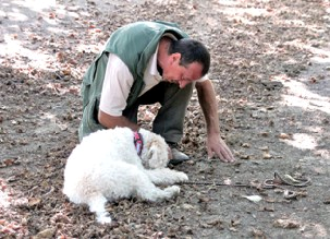 Mit der Nase am Boden festgesaugt, kreiselt Luca schnüffelnd um die Haselnussbäume, immer auf der Suche nach den leckeren Trüffeln. Gianni ist ganz offensichtlich be-geistert von Luca und scheint seine Meinung über die Schwererziehbar-keit des Lagotto-Rüden schon zu revidieren.